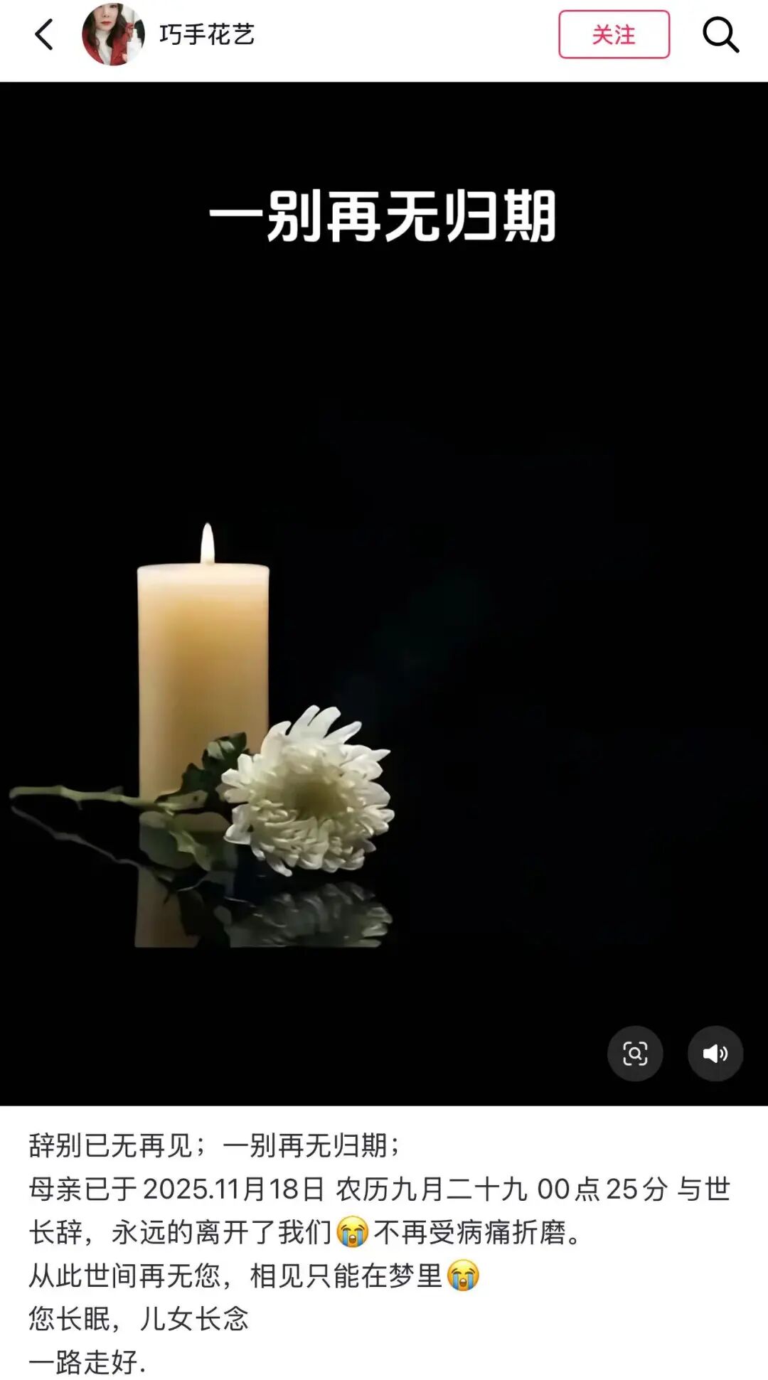 近日,湖北一博主“巧手花艺”患癌去世,其女儿用母亲账号发布一则动态,悼念母亲于18日凌晨去世,年仅44岁。